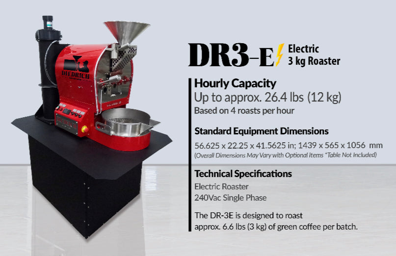 El tamaño del lote para el tostador eléctrico DR3-E es de aproximadamente 3 kg (6,6 lb) de café verde.